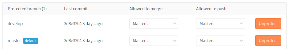 However, there are workflows where that is not needed, and only protecting from force pushes and branch removal is useful. For those workflows, you can allow everyone with write access to push to a protected branch by setting "Allowed to push" to "Developers + Masters".